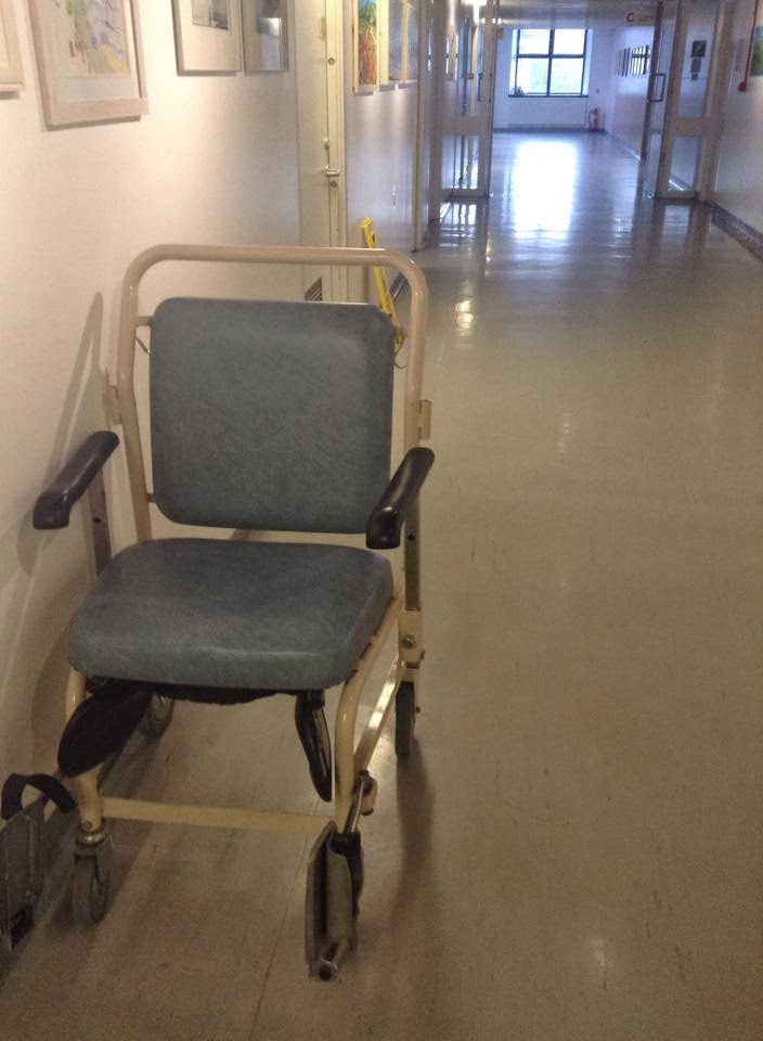 shows a man with a mask sitting on a wheel chair in the dark, watching the